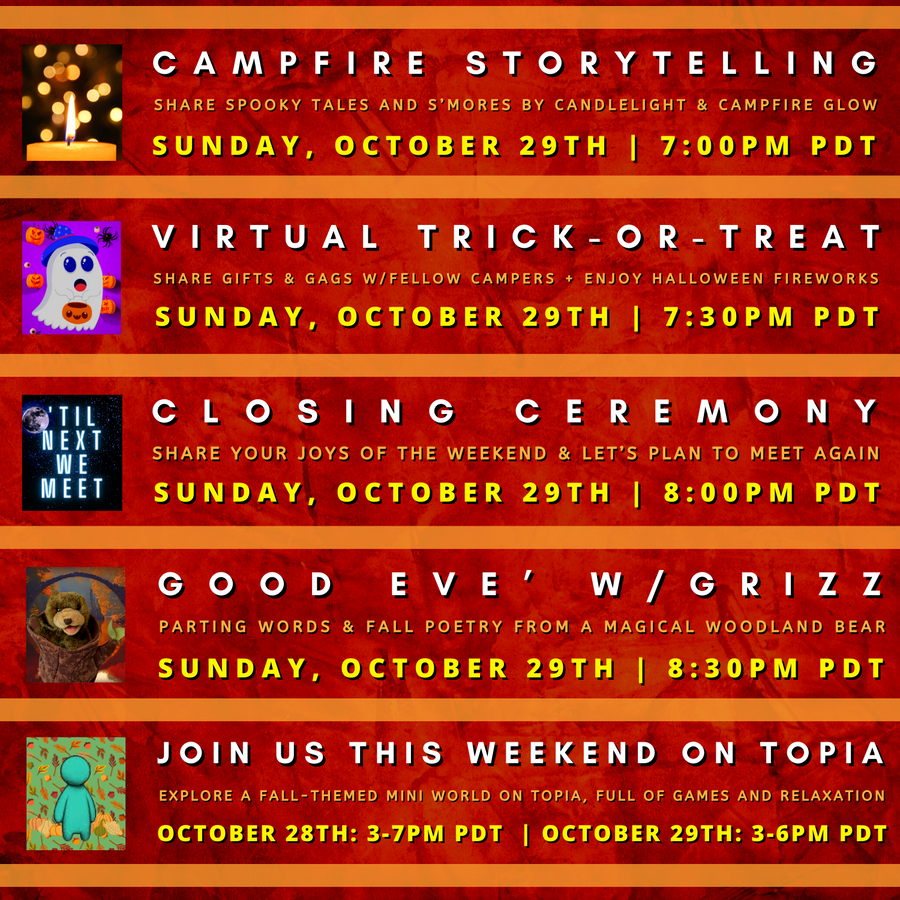 All "Zoomed" out? No worries, come join us in our virtual "Halloweenland" on Topia - happening simultaneously with our sessions on Zoom - and chat, explore, and relax with fellow campers!